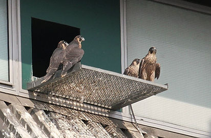 Tot in juli zijn de jonge slechtvalken nog te zien bij en rond de kast waar ze hun vliegvermogen trainen en van hun ouders prooi aangevoerd krijgen.